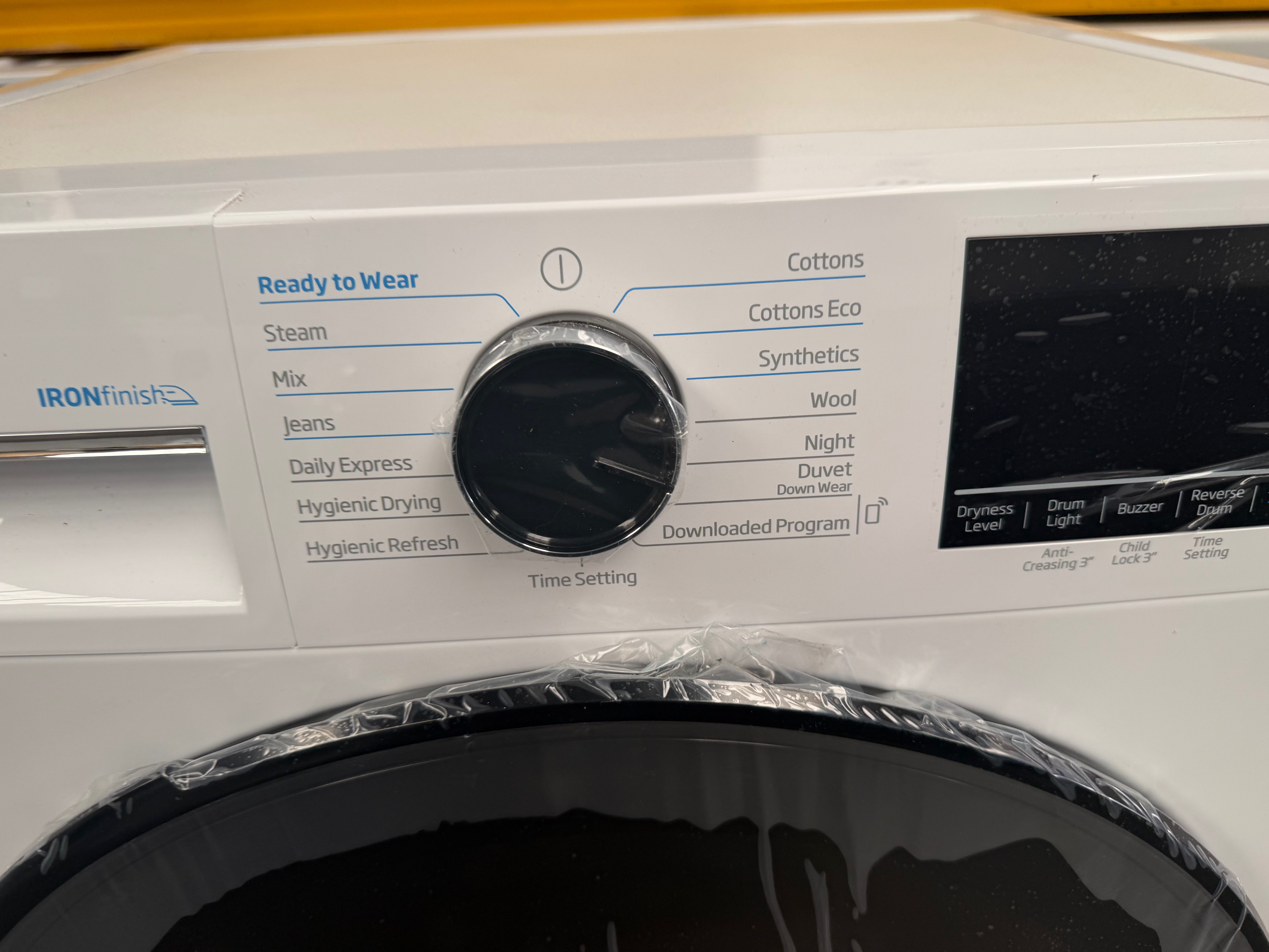 • Fifteen versatile drying programs: Cottons, Cottons Eco Dry, Synthetics, Night, Wool, Duvet/Downwear, Ready to Wear, Steam, Mix, Jeans, Xpress Super Short, Hygienic Drying, Hygienic Refresh, Time Setting, and Downloaded Programs (Bedding, Lingerie, Fashion, Outdoor/Sports, Towel).
