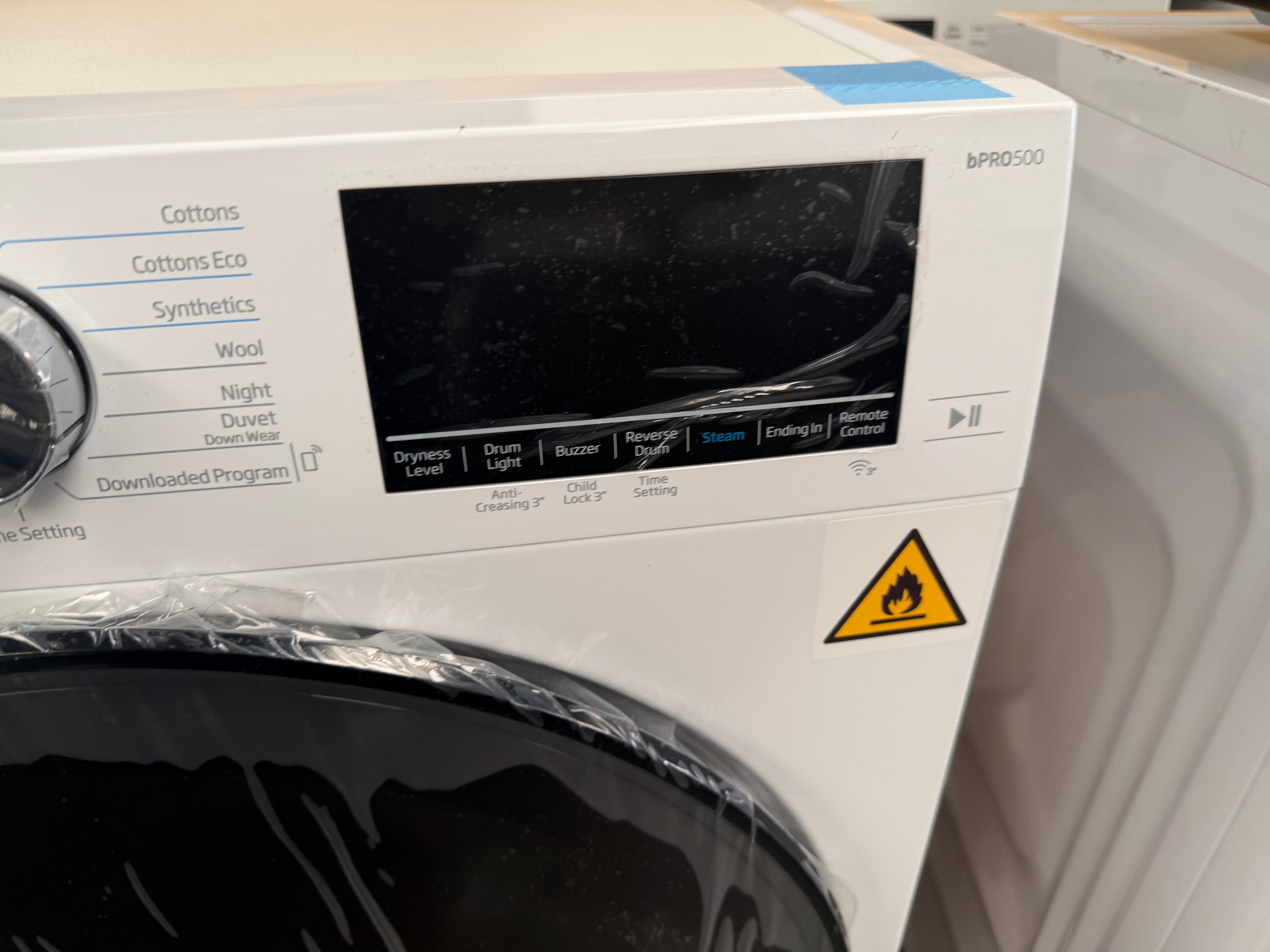 • Convenience features: Reverse tumbling, auto anti-creasing, LED digital display, drum light, delay timer, combined 2-in-1 filter, end-of-cycle buzzer, and child lock.
