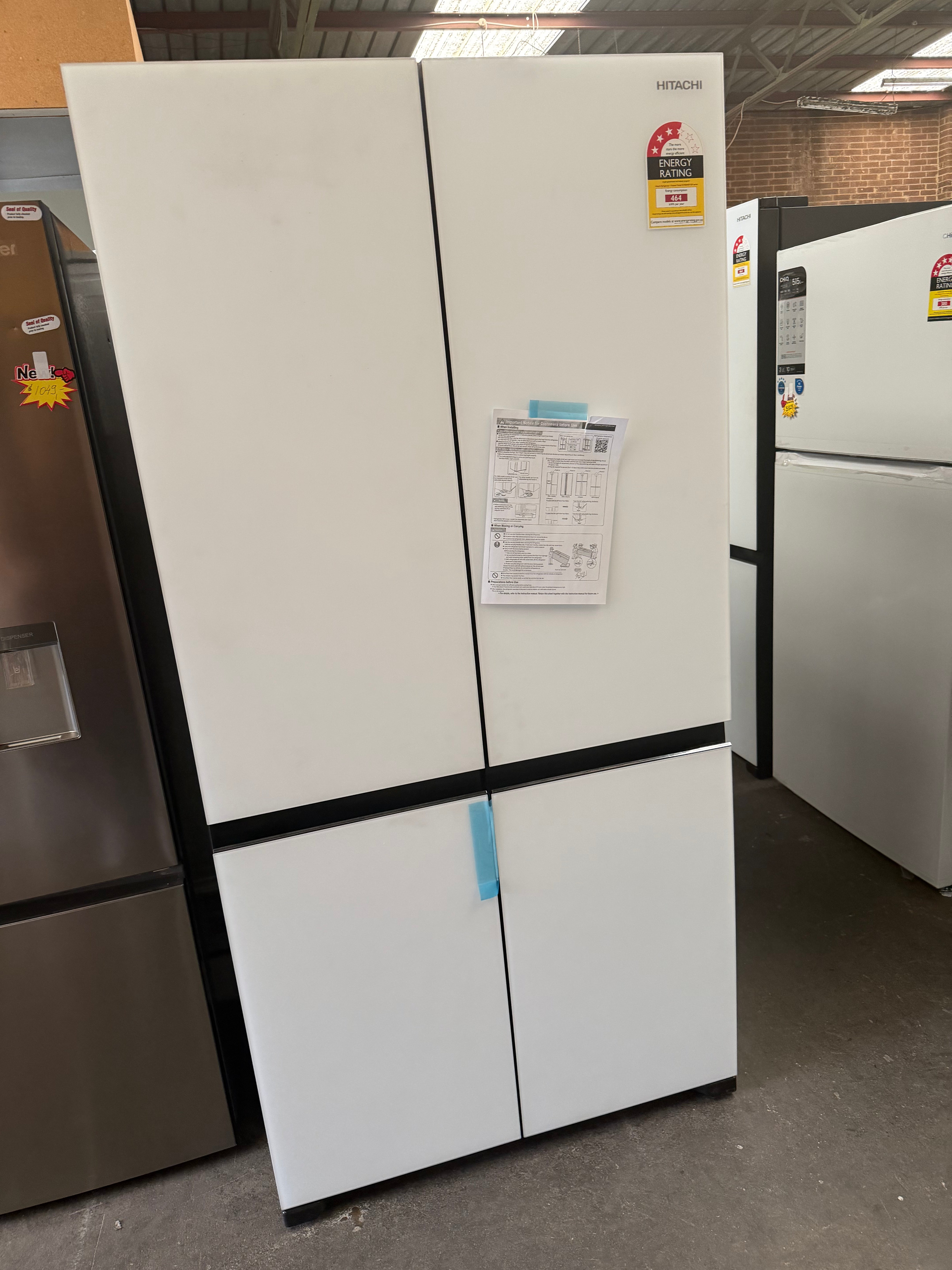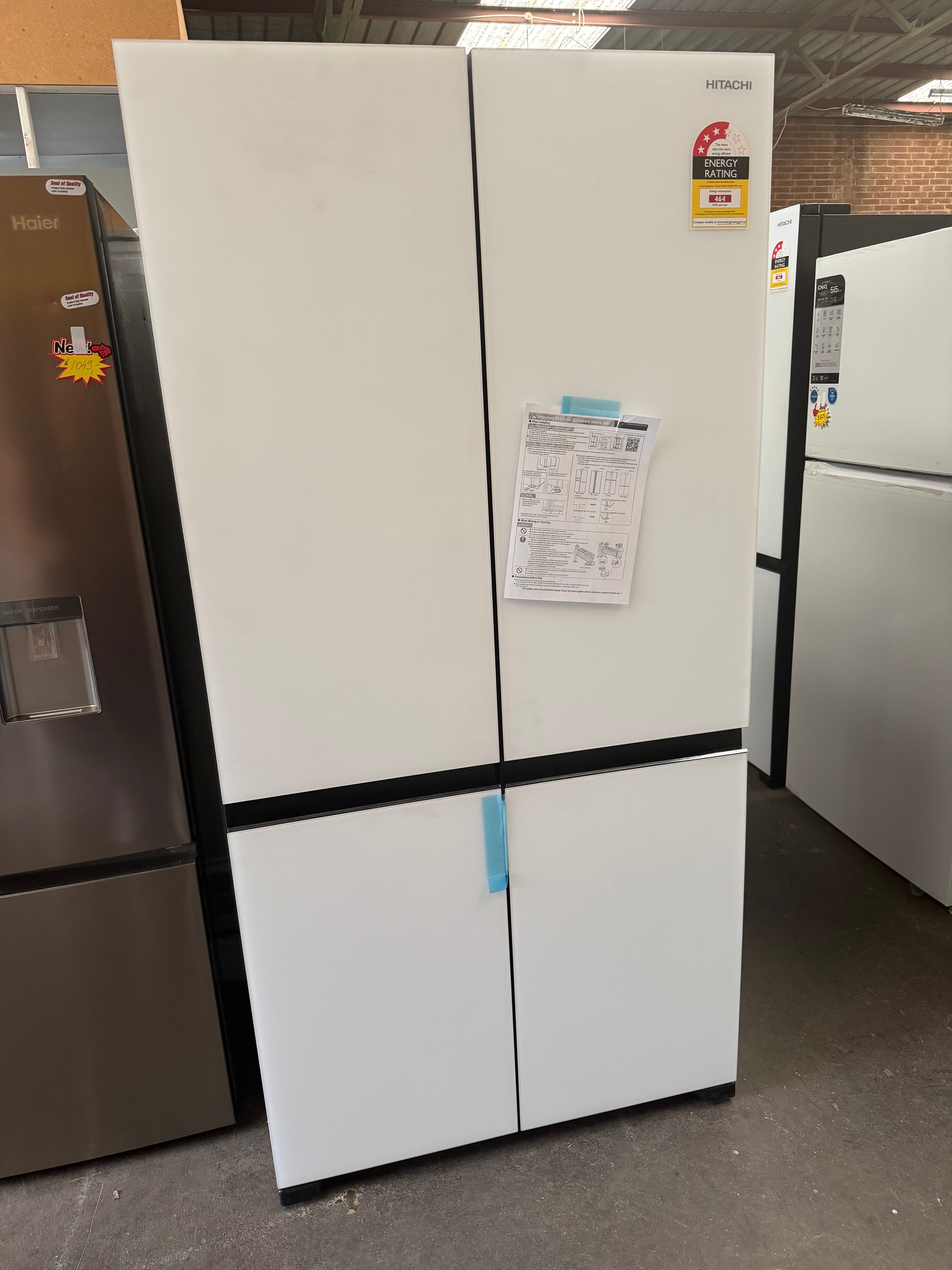 *Current Model* Hitachi 569L RWB640VT0X-1MGW Fridge with Non-Plumbed Ice Maker - Glass Matte White [Carton Damaged]